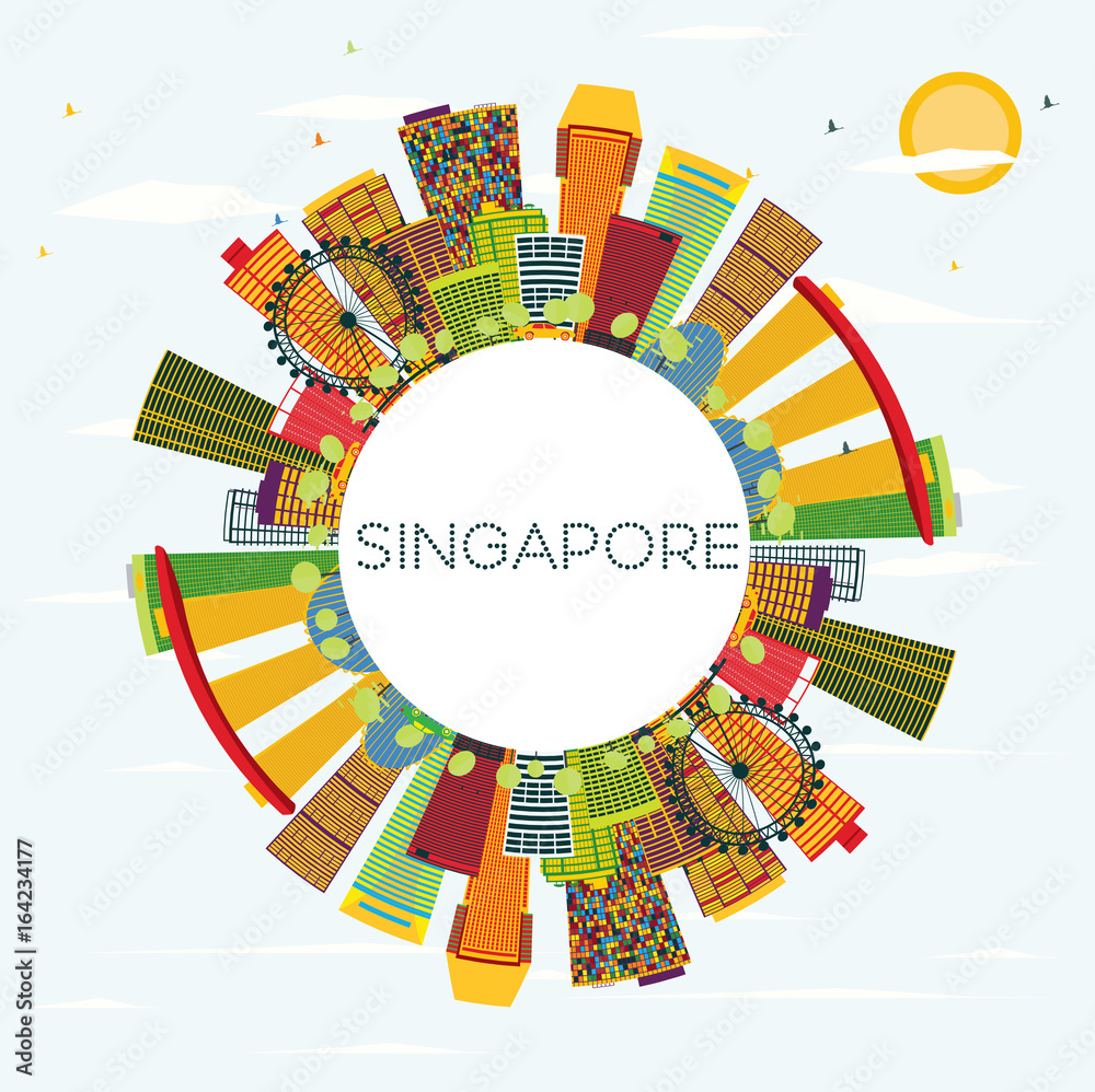 Fotografi Singapore Skyline with Color Buildings, Blue Sky and Copy Space.