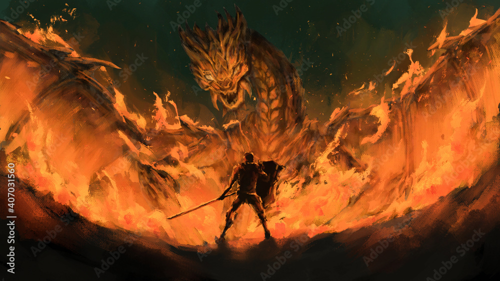 Billede på lærred warrior standing confront dragon in the flames,tale monster,creatures of myth and Legend ,digital art, Illustration painting