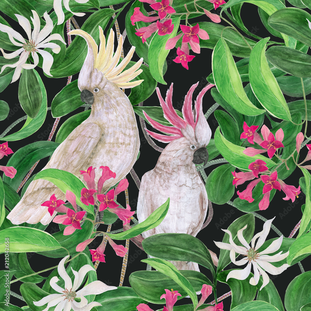 Fototapet Watercolor painting seamless pattern with white cockatoo birds and tropical flow