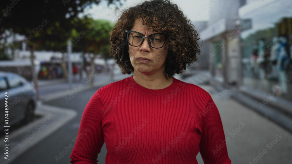 Fotografi Woman frowning on street wearing glasses amid urban storefronts and blurred vehicles under gray sky; annoyance